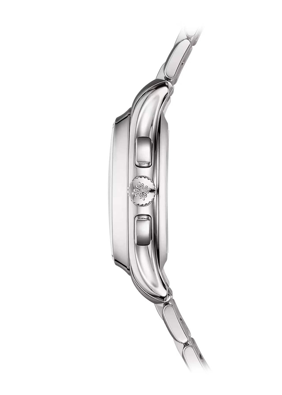 轉向錶殼設計,42 毫米的不鏽鋼錶殼展現出更貼近日常的佩戴風格。與過往貴金屬版本相比,鋼材的選擇不僅降低了距離感,也讓腕錶更具運動氣息。錶殼側面與錶耳的拋光處理,與鍊帶的拉絲質感形成對比,細節之間展現出品牌對工藝的高度要求。整合式鋼鍊帶的加入,是這款腕錶邁向現代運動風格的重要一步,其流暢線條與人體工學設計,讓佩戴時既穩固又舒適。