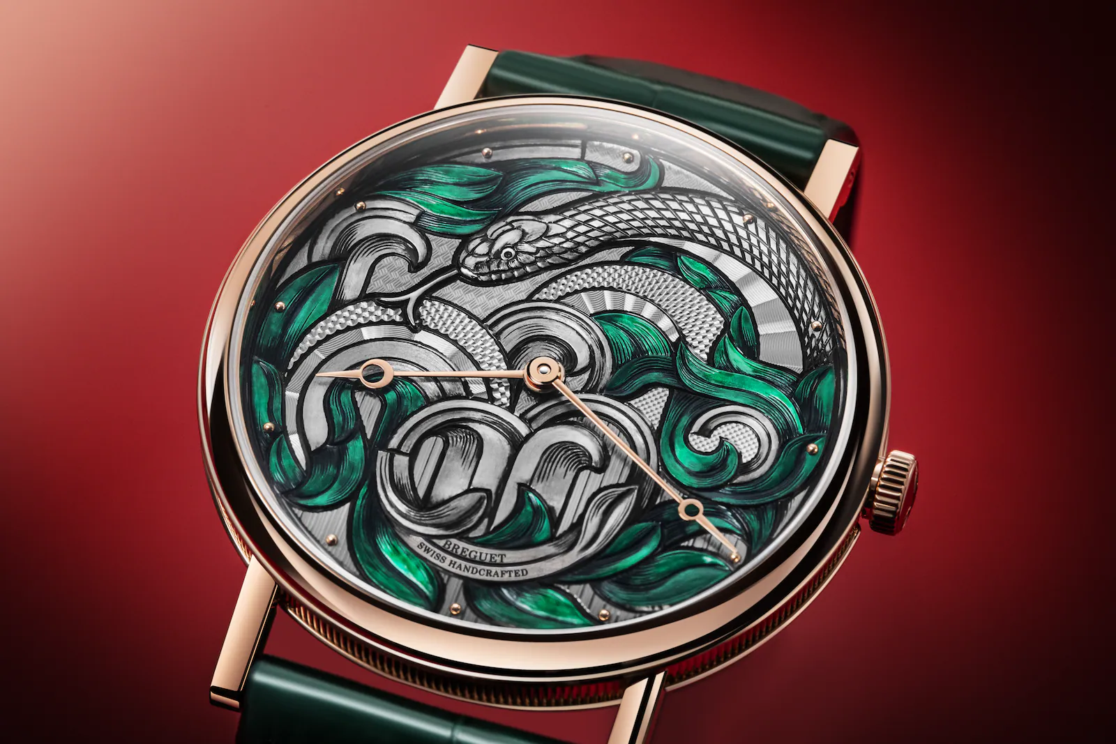 錶盤上的靈蛇雕刻細節經手工刻畫後覆以黑色塗層,營造出鮮明的對比效果,使圖案更具深邃感。隨後,工匠在錶盤上進行手工機刻雕花與拋光處理,凸顯複雜圖案的精緻層次。茂密的綠葉以半透明微繪塗料上色,展現深淺綠調的漸變之美,同時保留鐫刻工藝的精髓,整體風格和諧統一。純手工製作過程中,深綠與水綠的色調巧妙融合,成就了此一錶盤藝術傑作。