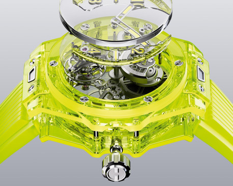 Hublot Big Bang陀飛輪螢光黃SAXEM腕錶,這款腕錶以先進的SAXEM材質製成,顏色鮮豔醒目。腕錶內部搭載HUB6035自動上鏈陀飛輪機芯,擁有72小時動力儲備和30米防水性能,全球限量僅50只。