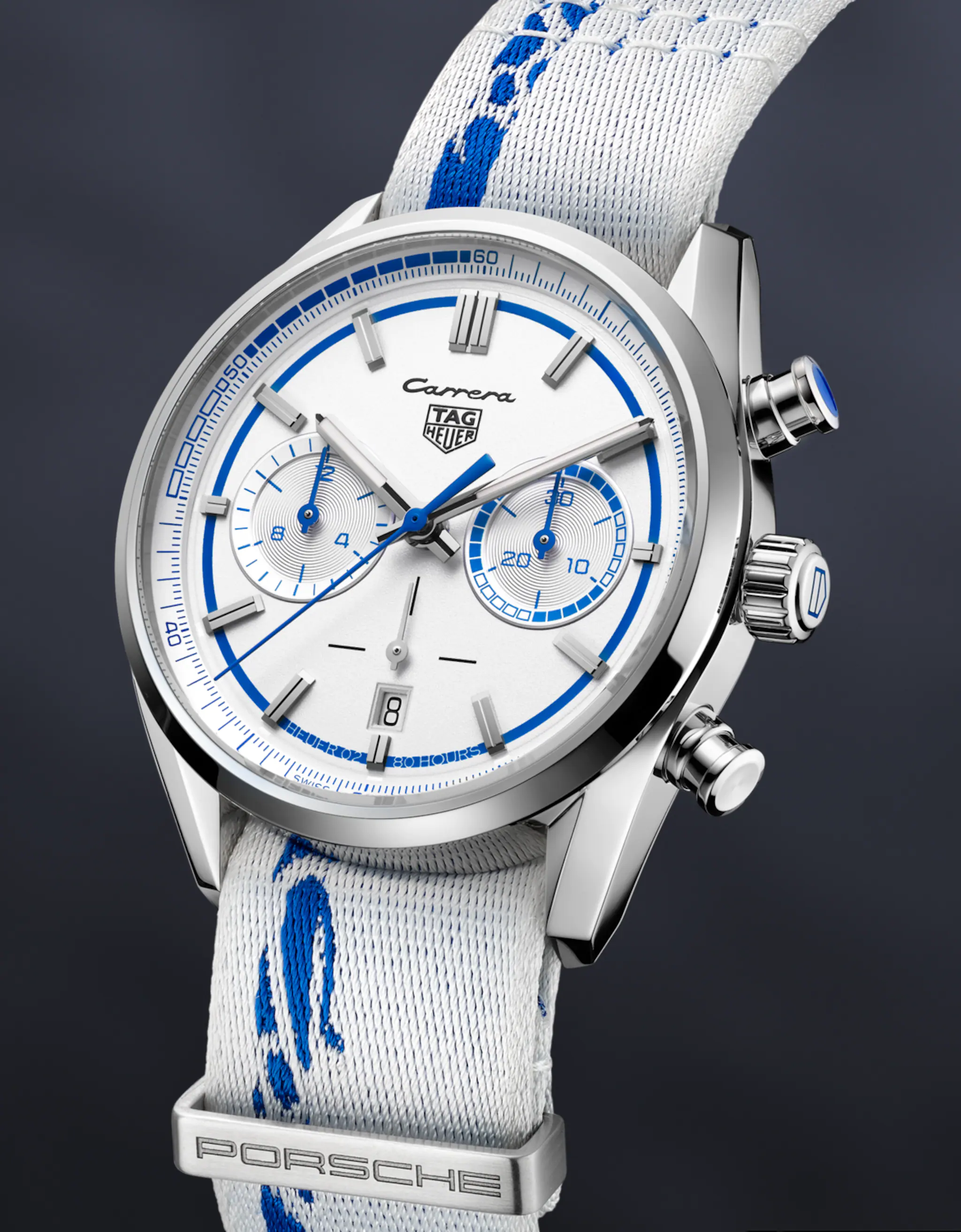 而保時捷的設計精神,在 TAG Heuer 作品中得到完美結合;藍色漆面的計時碼錶和中央指針,藍色塗料按鈕和錶冠上的盾牌標誌,以及 Heuer 02 機芯自動盤上的藍色標記。錶款透過藍色細節點綴,右側的小錶盤呈現出 Porsche 輪圈的美感,『Carrera』的字樣呈現於錶殼側面、錶面、錶帶上,展現出大膽設計。其中,這款限量腕錶還配備和 Porsche 911 Carrera RS 2.7 車款同樣印有藍色 Carrera 標誌的運動型織物錶帶,以及符合人體工學H型精鋼錶鍊,適合任何場合佩戴。